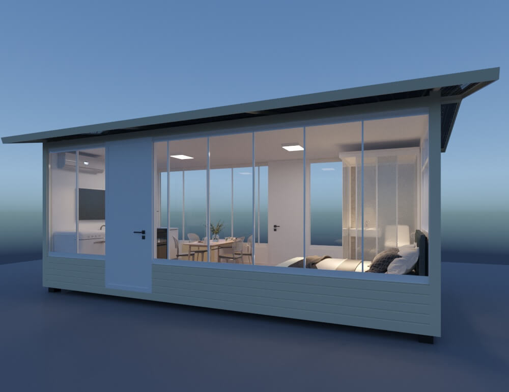 設計風格:1、立面外墻大面積使用透明U玻,通透的室內外視覺效果,實現室外景觀盡收眼底,前后景觀、前后門;2、平面布置適用多樣化??蛇x配廚房、餐廳、衛(wèi)生間、影音娛樂系統(tǒng)、新風系統(tǒng)應用于不同使用場景的配套。比如海上生活娛樂或野外辦公、海島及沙灘酒店客房等;3、框架材料使用鋁合金結構,重量輕、抗震看臺風。